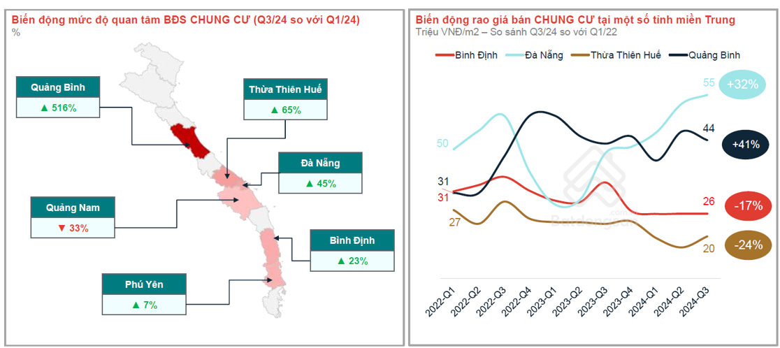 Xét theo từng loại hình, chung cư miền Trung gần đây có mức độ quan tâm tăng đáng kể. Cụ thể, vào quý III/2024, nhu cầu tìm kiếm chung cư Bình Định tăng 23% so với quý I/2024, chung cư Đà Nẵng tăng 45%, Thừa Thiên - Huế tăng 65%. Đặc biệt là Quảng Bình tăng mạnh nhất (516%). Giá rao bán chung cư tại Đà Nẵng và Quảng Bình ghi nhận mức tăng lần lượt là 32% và 41% vào quý III/2024 so với quý I/2022.