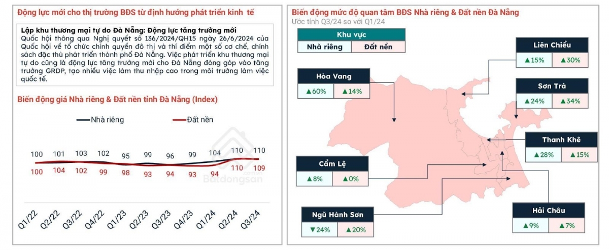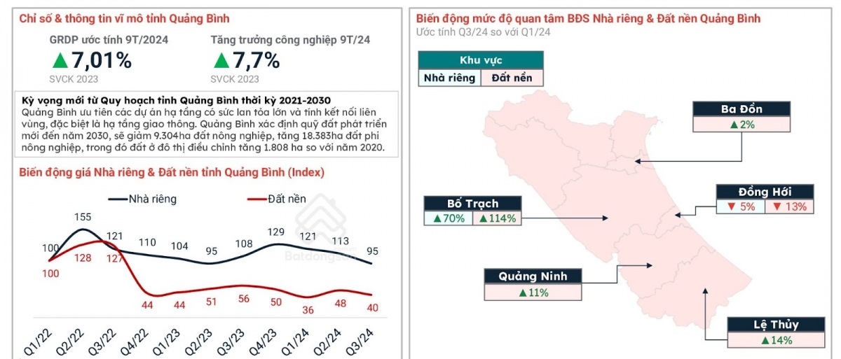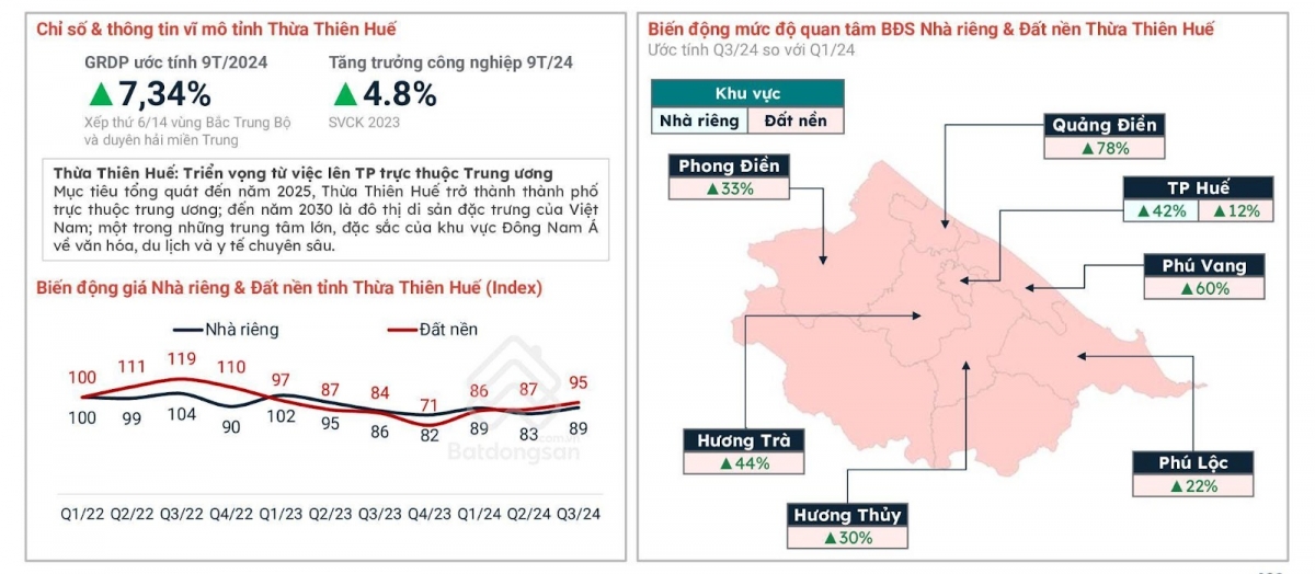 Trong khi đó, tại Thừa Thiên - Huế, mức độ quan tâm bất động sản nhà riêng và đất nền đã tăng mạnh vào quý III/2024 so với quý I/2024. Tiềm năng du lịch của tỉnh cũng hứa hẹn sẽ được thúc đẩy bởi việc trở thành thành phố trực thuộc trung ương và mục tiêu đến năm 2023 là đô thị di sản đặc trưng của Việt Nam.