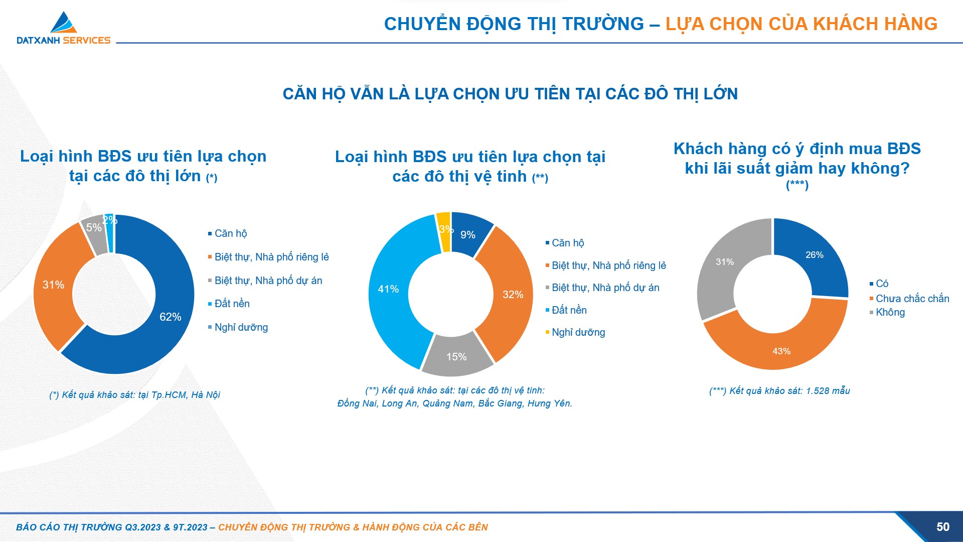 Báo cáo thị trường của Dat Xanh Services cũng chỉ rõ, trong quý 3/2023, thị trường ghi nhận lượng giao dịch thực tế chưa tăng. Song, tâm lý của khách hàng đã được cải thiện. Tỷ lệ tìm kiếm bất động sản của khách hàng gia tăng, đặc biệt là phân khúc phục vụ nhu cầu ở thực.