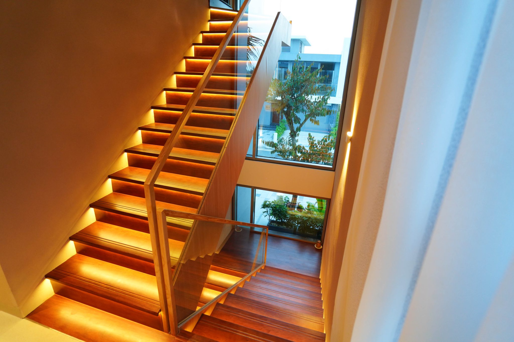 Bước lên cầu thang gỗ được thiết kế tinh tế, mang đến cảm giác nhẹ nhàng và thoáng đãng, hoàn hảo cho không gian hiện đại. Điểm nhấn ấn tượng nhất là dải đèn LED ấm áp được tích hợp dưới từng bậc thang, không chỉ tôn lên vẻ đẹp thiết kế mà còn đảm bảo ánh sáng an toàn, tiện lợi cho việc di chuyển.