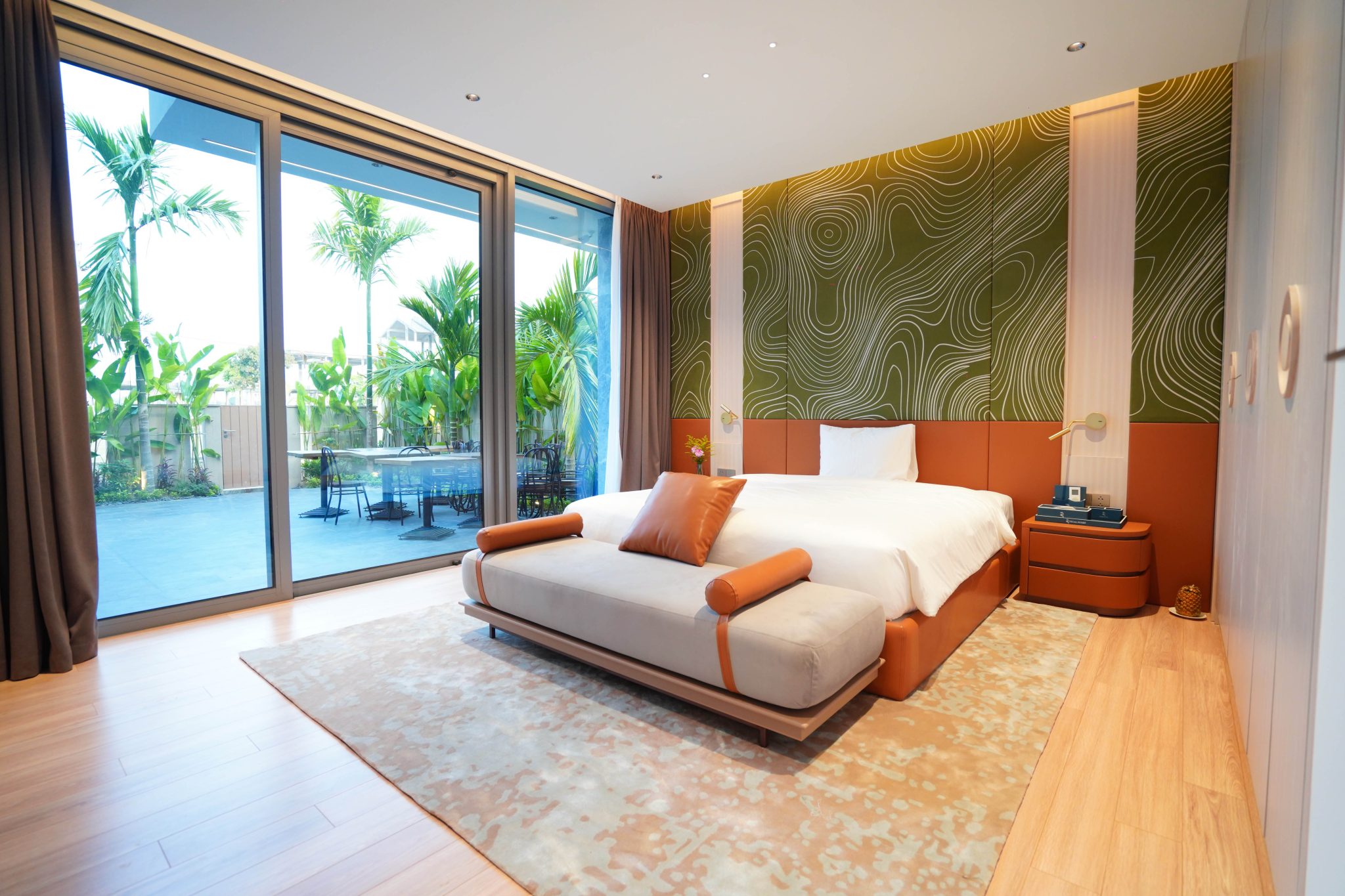 Đầu tiên, phải kể đến là hệ thống cửa kính chạm sàn mở ra khung cảnh tuyệt mỹ, bao trọn dải xanh muôn sắc trải dài đến vô tận, tạo nên một không gian sống đầy ấn tượng với tầm nhìn không giới hạn. Sự chuyển tiếp mềm mại giữa thiên nhiên và nội thất mang đến cảm giác hài hòa, uyển chuyển, biến ngôi nhà ở Victoria Pool Villas như một chốn trở về bình yên, độc đáo và đậm phong cách sang chảnh, thượng lưu.