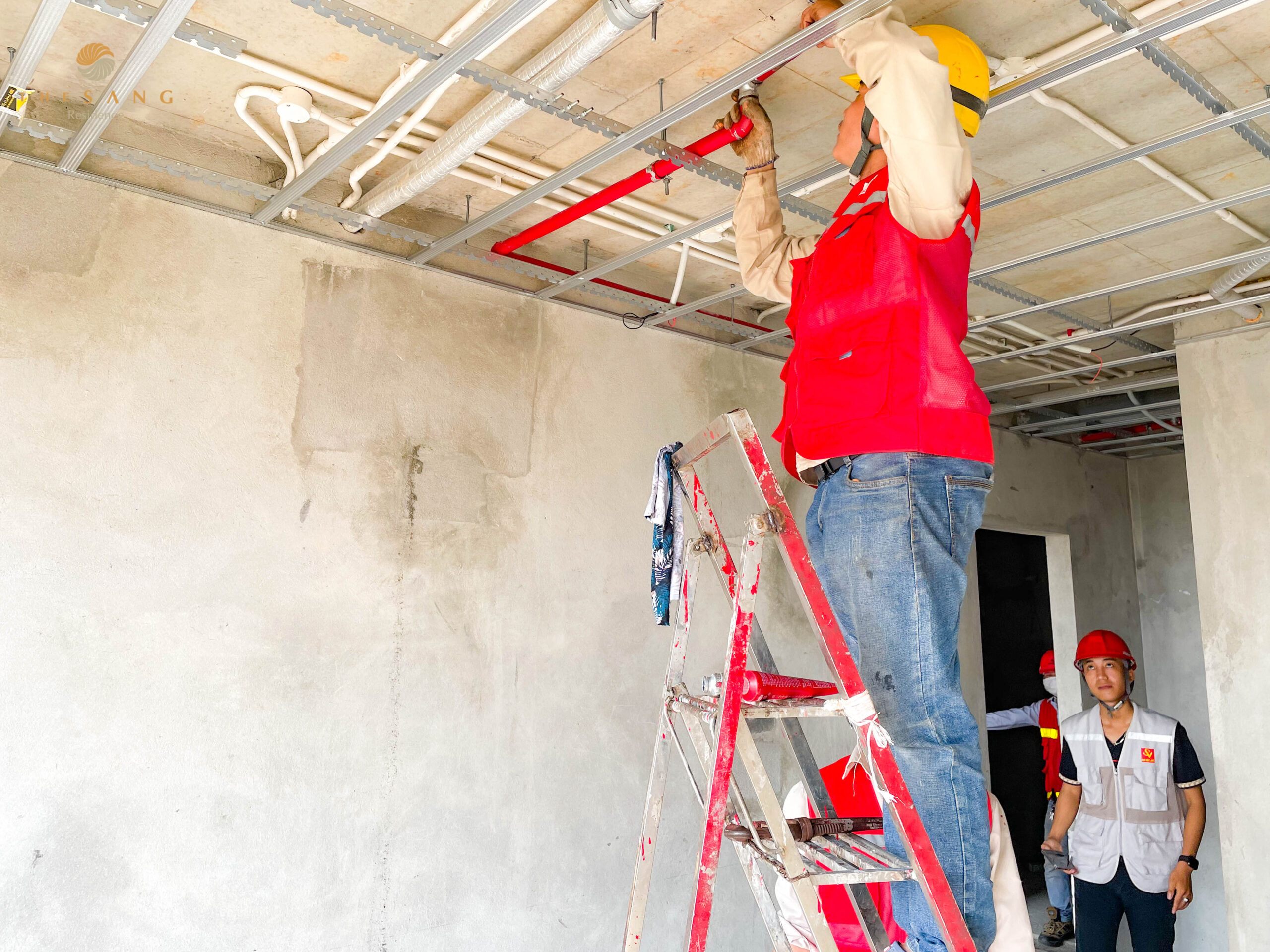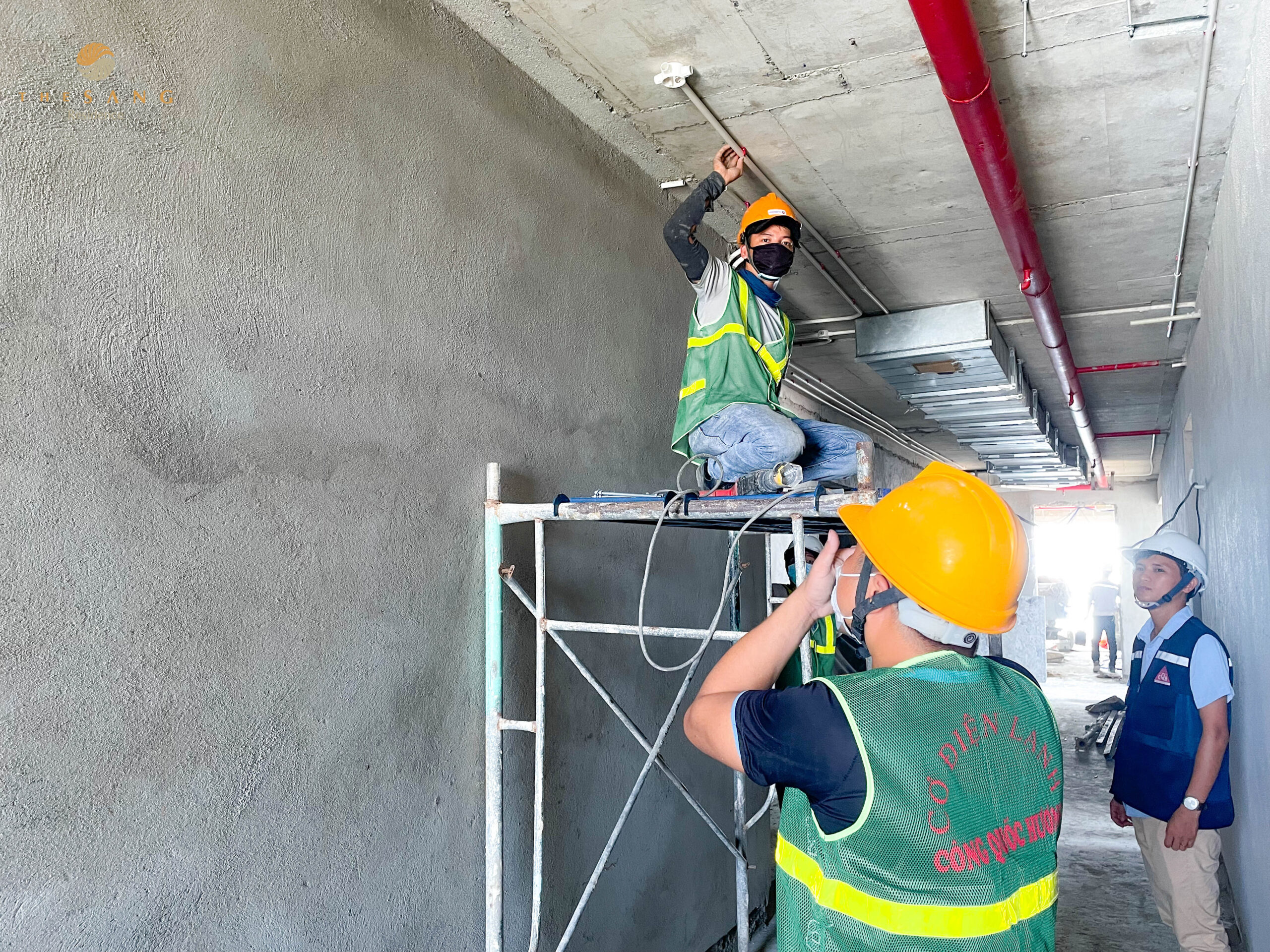 Thi công trục đứng ống gió từ tầng 4 đến tầng 10, hoàn thiện đầu phun chữa cháy từ tầng 5 đến tầng 8. Thi công máng đến hành lang, điện âm tường tầng 2 đến tầng 4