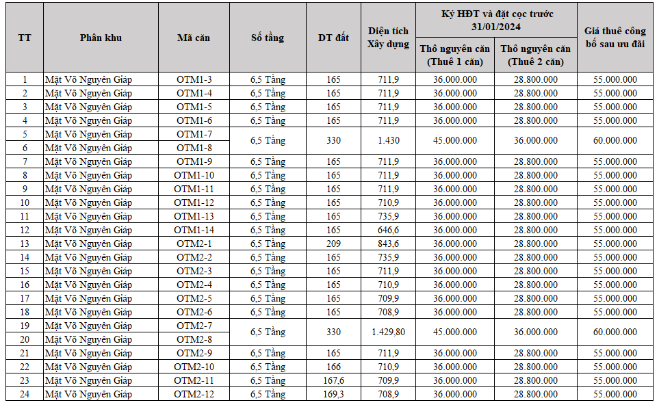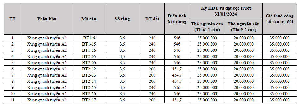 - Điều kiện được hưởng giá thuê ưu đãi theo bảng giá thuê chi tiết tại phụ lục 01: Áp dụng cho các khách thuê ký hợp đồng trước ngày 31/01/2024, khai trương vận hành trước 30/06/2024.