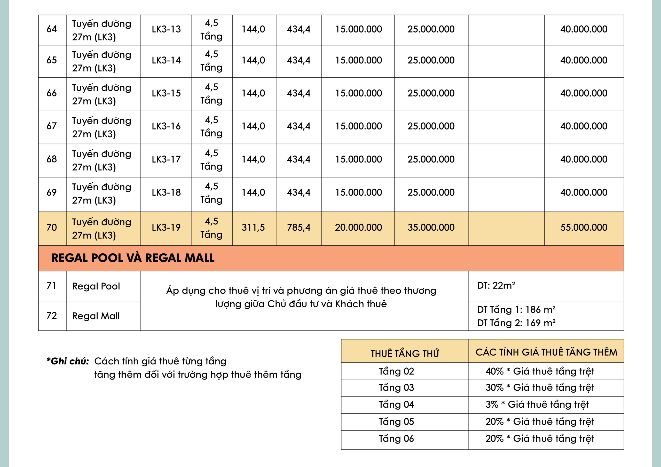 + Riêng đối với khu thương mại mặt hồ Regal Pool vàb Regal Mall sẽ đánh giá thương hiệu, tiêu chí các khách hàng thuê trong vòng 01 tháng kể từ ngày bên thuê nộp phương án kinh doanh cơ bản về khối thương mại.