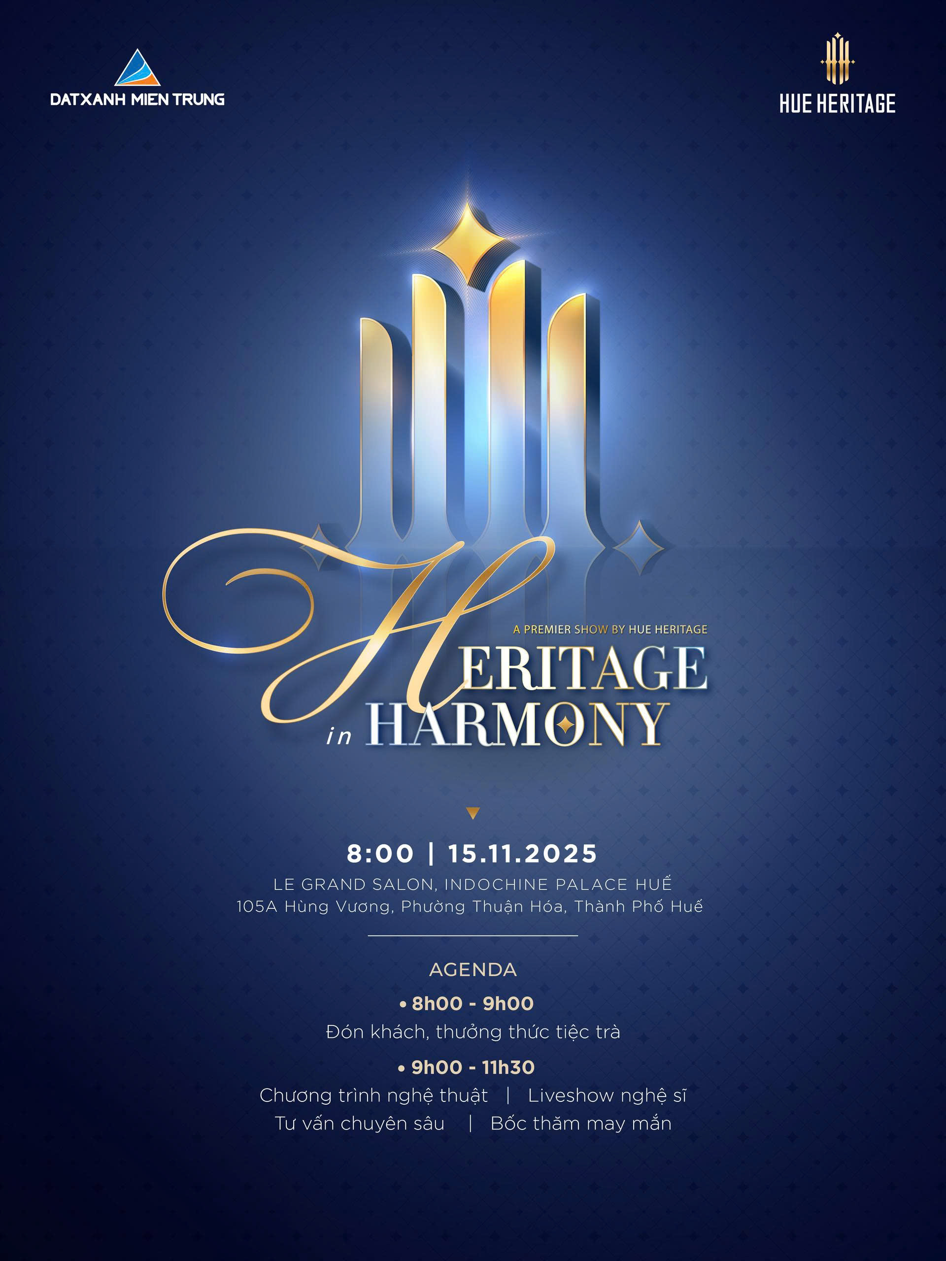 Từ Huế xưa đến kiệt tác nhà ở Hue Heritage hôm nay, sự kiện “A Premier Show – Heritage in Harmony” sẽ tái hiện những đường nét kiến trúc đặc trưng cùng giá trị tinh hoa được chọn lọc. Đan cài trong thời khắc “khai màn di sản” Hue Heritage là câu chuyện về một Huế phồn vinh và giàu bản sắc, được kể qua những tiết mục nghệ thuật truyền thống kết hợp đương đại và đặc biệt có sự xuất hiện của nghệ sĩ ngôi sao nổi tiếng.