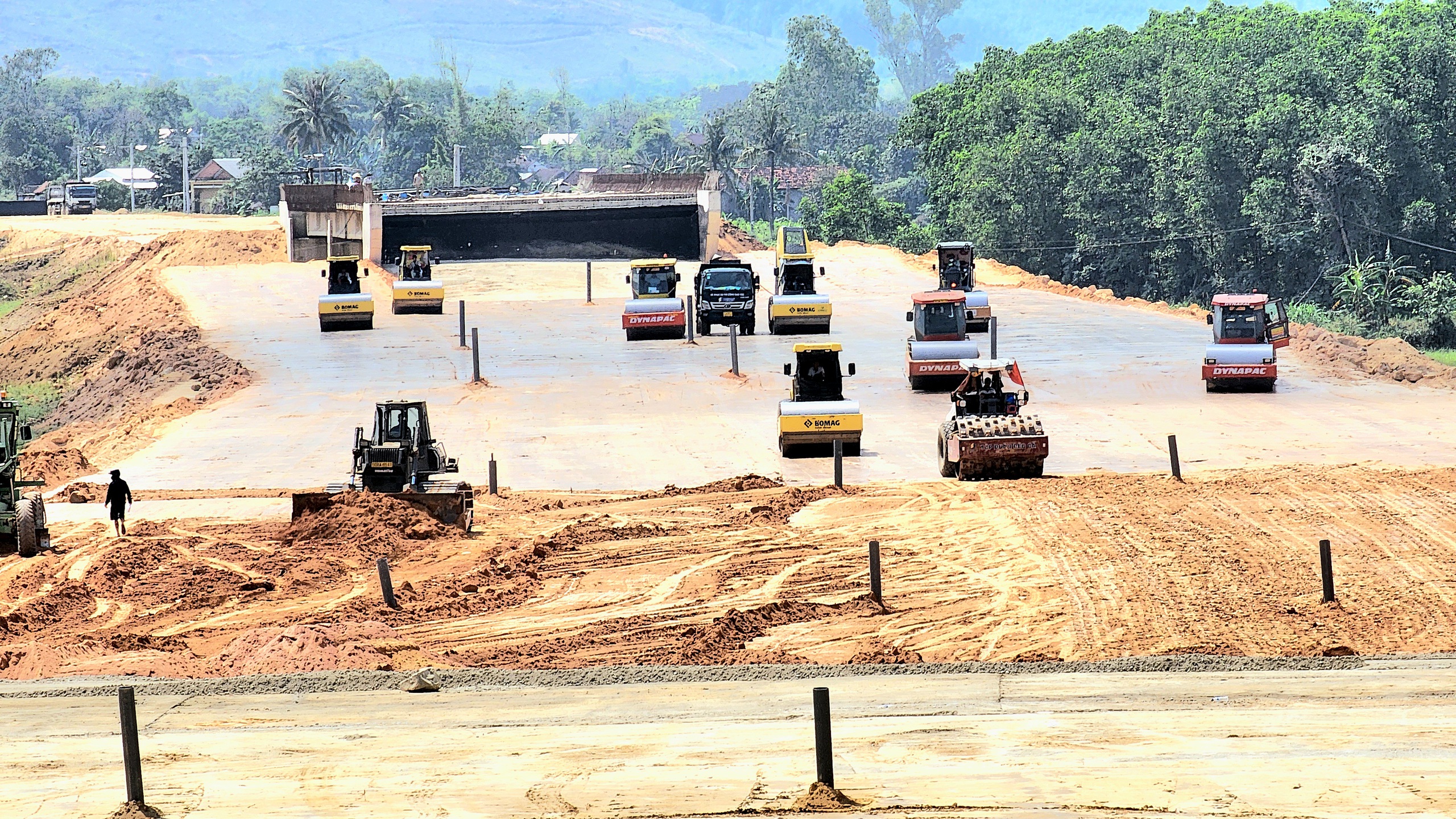 Công tác đắp đất nền K95, K98 được triển khai dọc theo toàn tuyến. Đến nay, công tác đắp đất nền đạt 9,7 triệu m3 trong tổng số hơn 10,9 triệu m3. Phần lớn nền đường đã hoàn thiện lớp đắp K95, chuyển sang đắp K98 và cấp phối đá dăm. Sẵn sàng cho bước thi công bê tông gia cố xi măng, thảm nhựa.