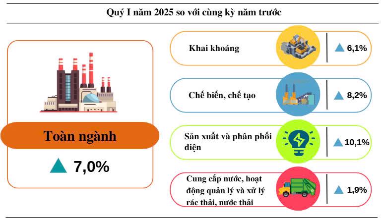 Tính chung quý 1/2025, chỉ số sản xuất toàn ngành công nghiệp của Quảng Bình tăng 7,0% so với cùng kỳ năm trước. Trong đó, ngành khai khoáng tăng 6,1%; ngành công nghiệp chế biến, chế tạo tăng 8,2%; ngành sản xuất và phân phối điện tăng 10,1%; ngành cung cấp nước, hoạt động quản lý và xử lý rác thải, nước thải tăng 1,9% so với cùng kỳ năm trước. Một số sản phẩm công nghiệp chủ yếu sản xuất trong quý I/2025: Quặng titan đạt 6.904 tấn, giảm 19,1% so với cùng kỳ năm trước; đá xây dựng đạt 323.104 m3, tăng 2,0%; cao lanh đạt 21.335 tấn, tăng 68,7%; thủy hải sản chế biến các loại đạt 7.196 tấn, tăng 26,7%....