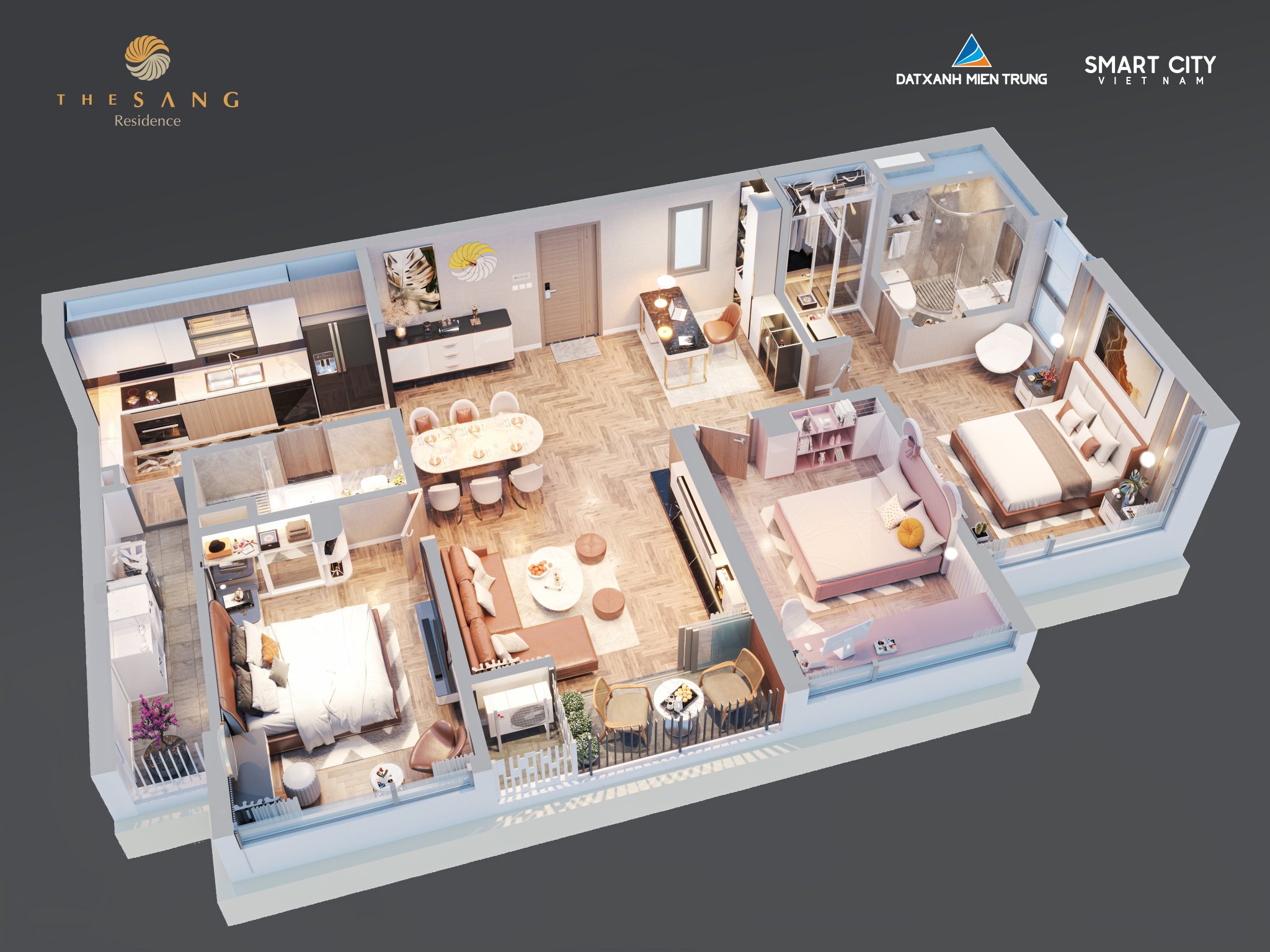 Được tính toán tỉ mỉ, căn hộ 3 phòng ngủ The Sang Residence có vị trí góc với 2 mặt thoáng, không gian sống rộng rãi thoải mái cùng bài trí thông minh, phù hợp với nhiều đối tượng, từ gia đình trẻ có 3-4 thành viên tới những gia đình đa thế hệ.
