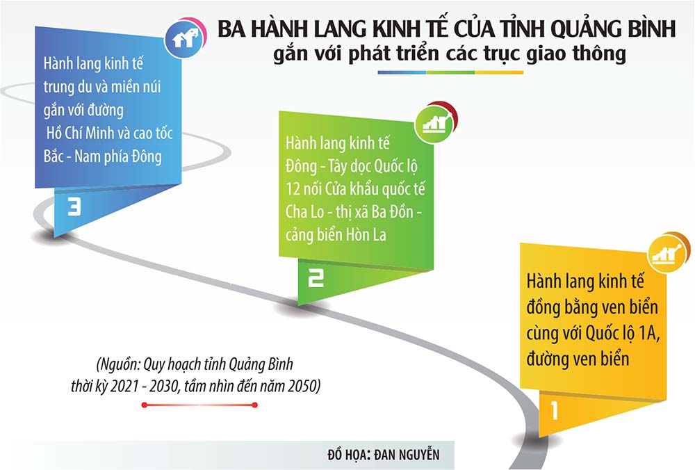 Quy hoạch tỉnh Quảng Bình thời kỳ 2021 - 2030, tầm nhìn đến năm 2050 cũng nêu rõ những ưu tiên phát triển của tỉnh, trong đó có 3 hành lang kinh tế, cũng là định hướng liên kết không gian đối với các hoạt động kinh tế - xã hội thông qua các tuyến giao thông.