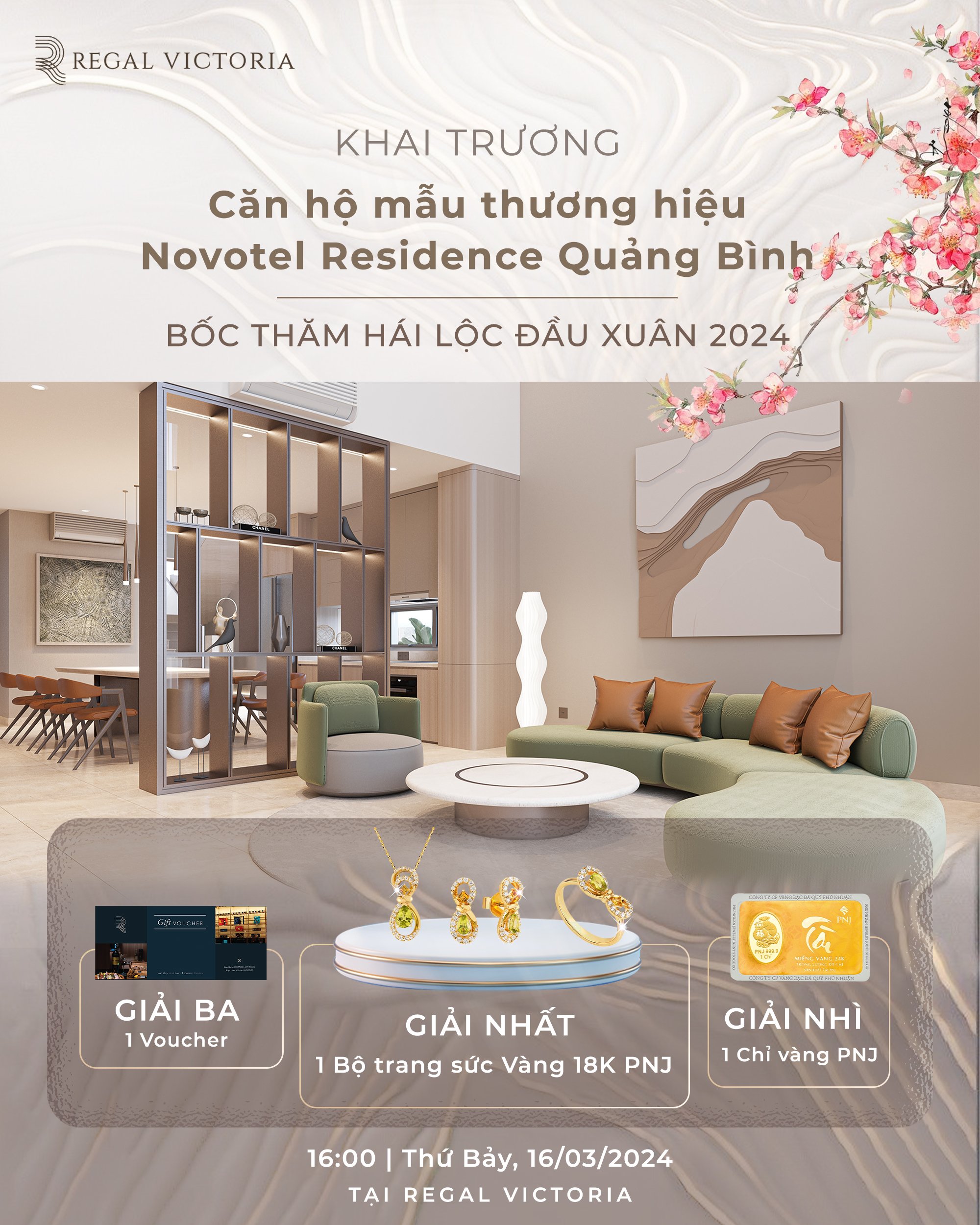 Sự kiện: Khai tương căn hộ mẫu thương hiệu Novotel Residence Quảng Bình Thời gian: 16h00, thứ sáu, ngày 16/3/2024 Địa điểm: Khu Villa compound Regal Victoria