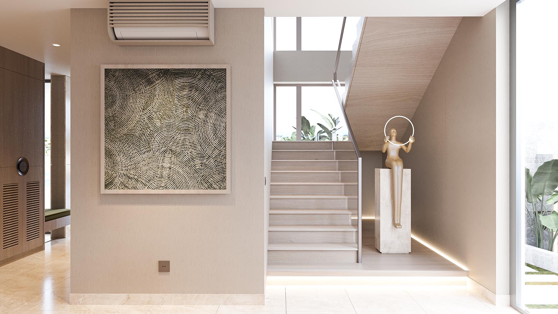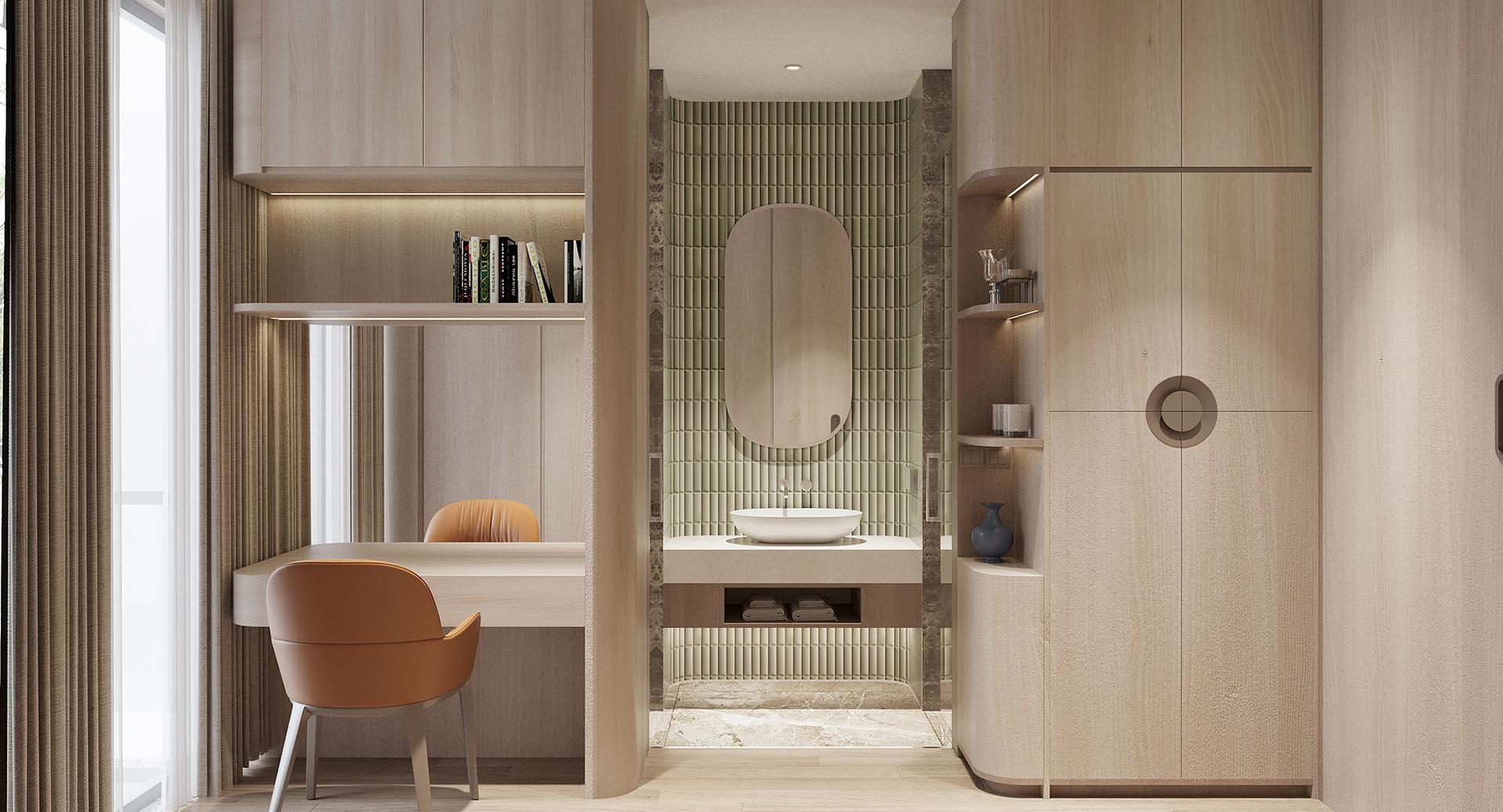 Sự đồng bộ trong thiết kế và cách sử dụng vật liệu đồ nội thất tô điểm thêm vẻ đẹp tinh tế cho không gian. Chiếc gương vòm cong giúp tạo cảm giác rộng rãi cho khu vực này. Sự phù hợp kích thước của đồ nội thất cũng là yếu tố chính làm nên sự hoàn hảo.