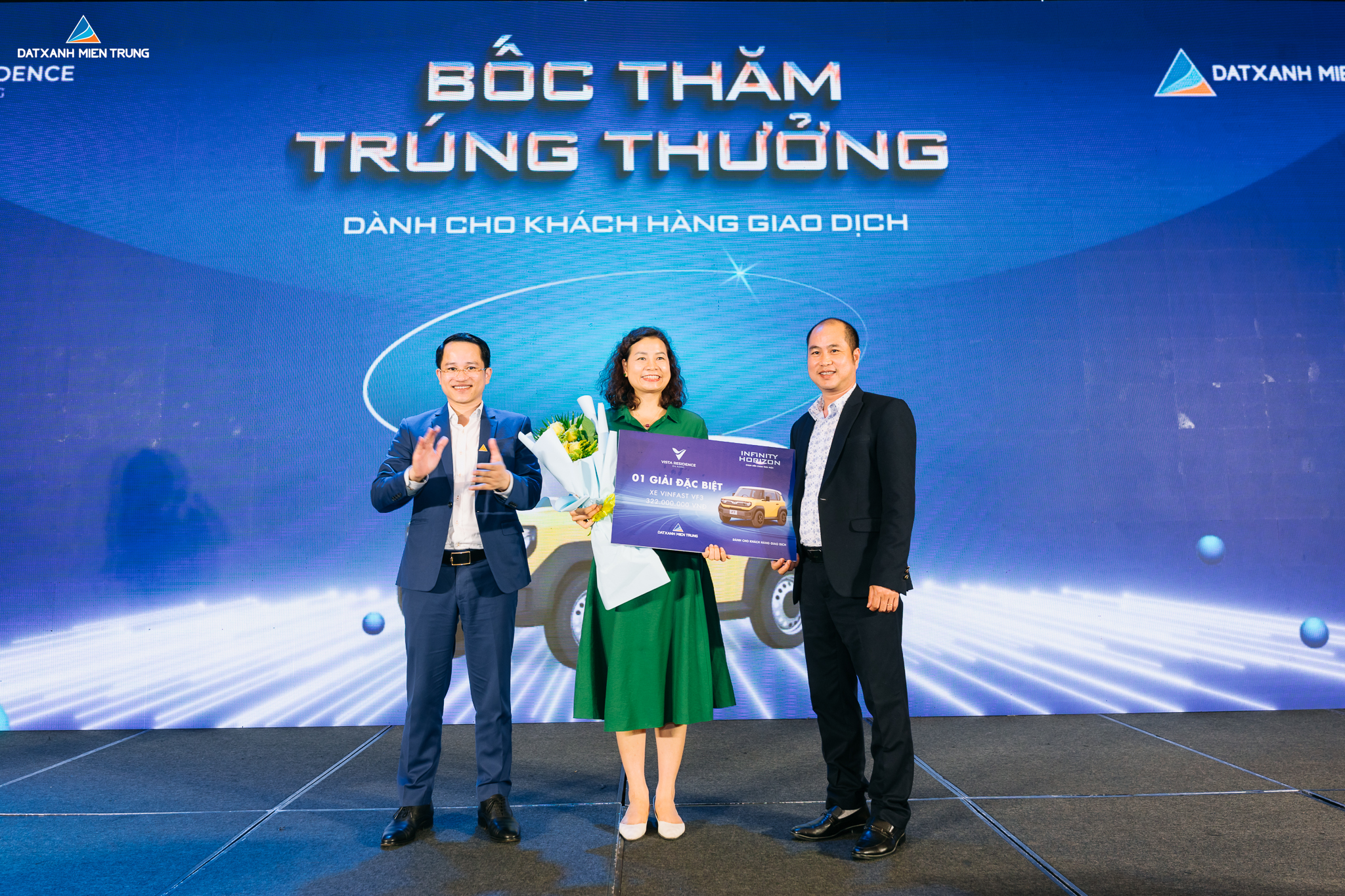 Tại sự kiện lễ mở bán lần này, Đất Xanh Miền Trung cũng đã tổ chức chương trình bốc thăm trúng thưởng với tổng giá trị lên đến 400 triệu đồng. Đáng chú ý, giải đặc biệt là chiếc xe điện VinFast VF3 trị giá 322 triệu đồng đã tìm thấy chủ nhân. Bên cạnh đó, nhiều khách hàng tham dự cũng nhận được loạt phần quà giá trị như tủ lạnh Bosch, máy giặt sấy Hitachi, iPad Gen 10,...