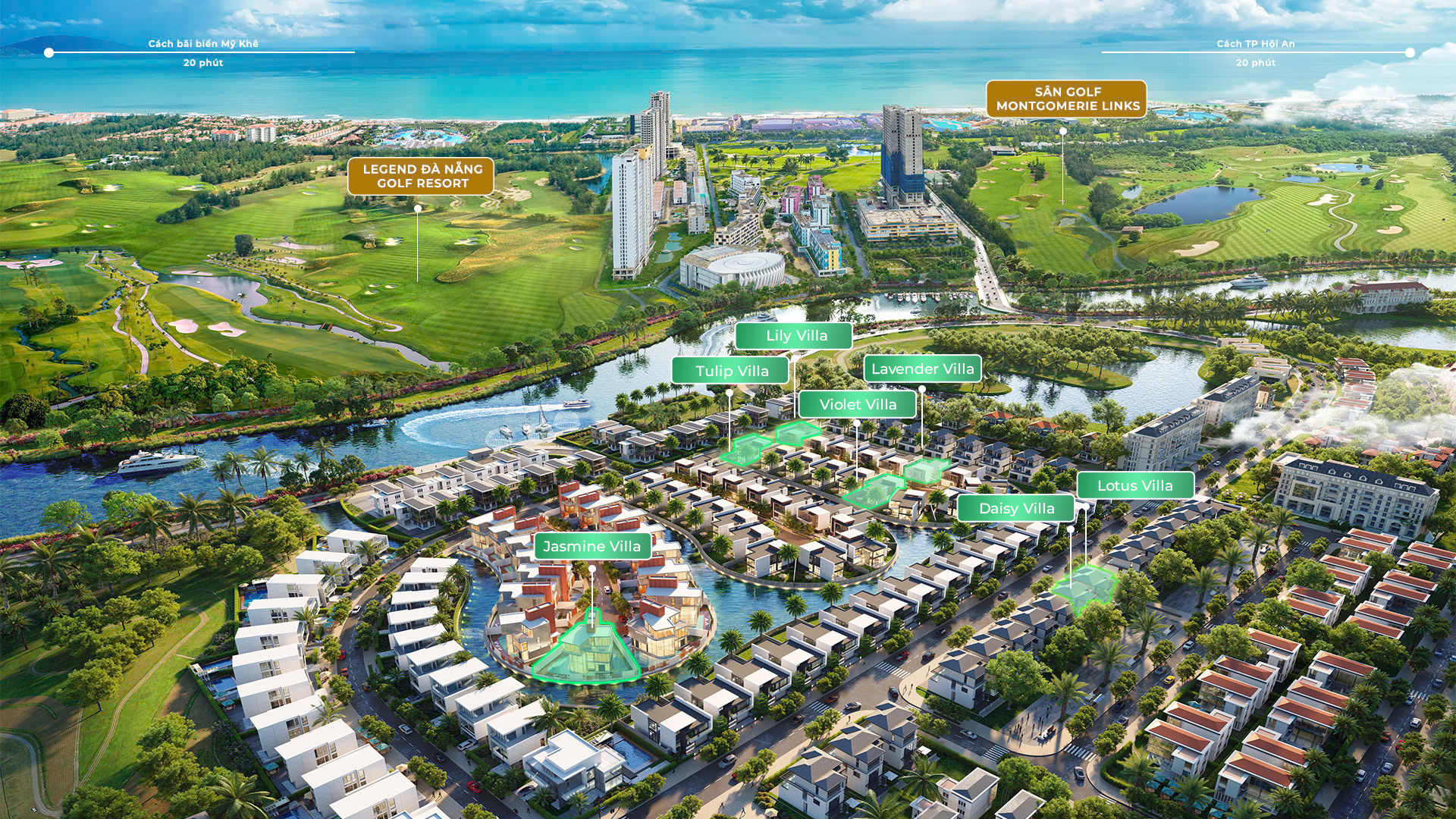 Một trong những điểm đắt giá của khu biệt thự này là sở hữu vị trí kim cương, nơi giao hòa giữa thiên nhiên, văn hóa của vùng đất Quảng Nam và Đà Nẵng. Chỉ 20 phút, cư dân đã có thể di chuyển đến phố cổ Hội An, thưởng lãm vẻ đẹp cổ kính, thơ mộng hay chỉ 20 phút là có thể đến với bãi biển Mỹ Khê – Top 10 bãi biển xinh đẹp hàng đầu thế giới.