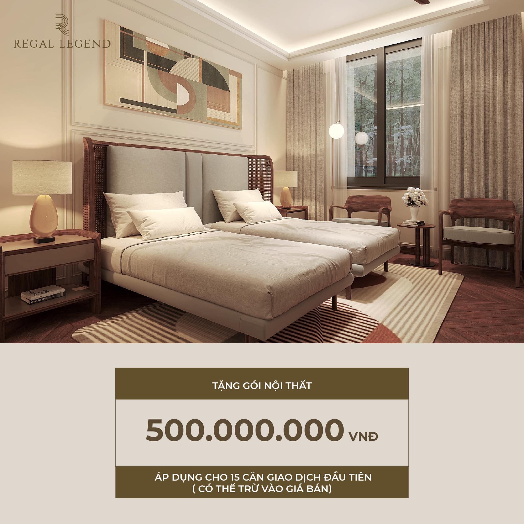 Đặc biệt, Regal Group tặng gói nội thất lên đến 500 triệu đồng (trừ trực tiếp vào giá bán); Cam kết lãi suất đầu tư trong 2 năm với mức 5% / giá trị hợp đồng / năm; cùng chương trình ưu đãi
