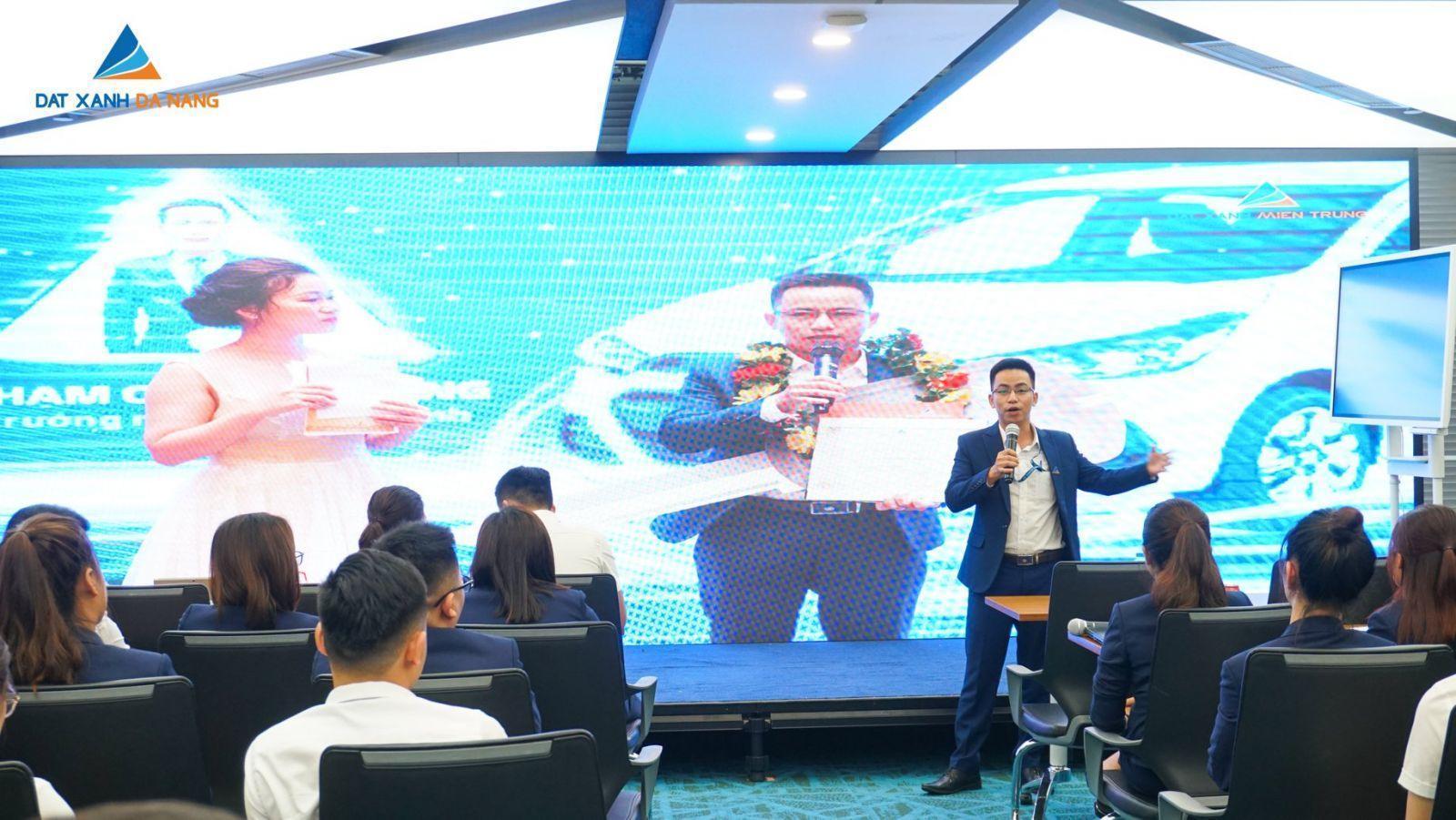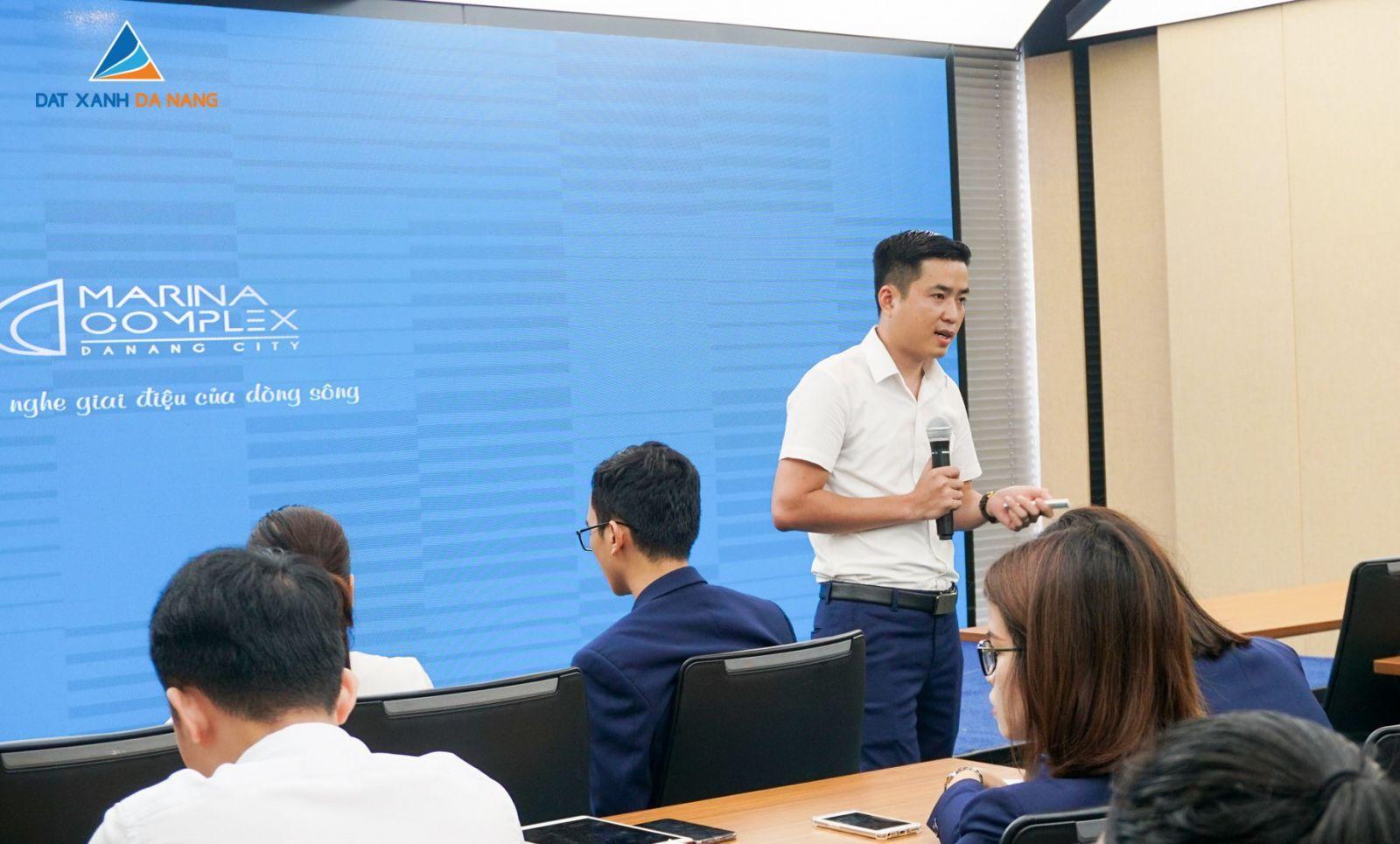 Đại diện Ban Lãnh đạo Công ty, Ông Nguyễn Hữu Phin – Phó Giám đốc Kinh doanh với vai trò đại biểu chủ trì chương trình đã mang đến những kiến thức bổ ích liên quan đến việc bán các dòng sản phẩm BĐS hạng sang, trong đó điển hình là dự án Marina Complex – siêu phẩm BĐS ven sông Hàn đang được giới đầu tư quan tâm. Để Nhân viên Kinh doanh (NVKD) có cái nhìn chính xác và thực tế nhất về các dự án cao cấp, Ông Phin đã áp dụng Marina Complex làm minh chứng minh họa và kết hợp những dẫn chứng, tư vấn mẫu đặc biệt bổ ích.
