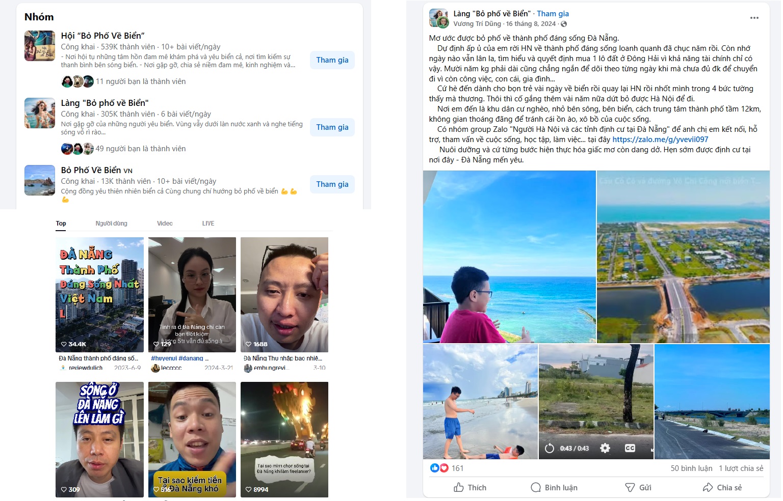 Không chỉ anh Thắng, thời gian gần đây, nhiều người Hà Nội hoặc Việt Kiều cũng chọn Đà Nẵng - Hội An (Quảng Nam) trở thành nơi an cư lập nghiệp. Các hội nhóm chia sẻ kinh nghiệm cách bắt đầu cuộc sống mới tại Đà Nẵng, Hội An, từ việc tìm nhà ở thuê, cách chọn mua nhà, chọn trường học cho con hay các trải nghiệm cuộc sống ở thành phố biển mà thị dân thủ đô chưa từng được trải qua thu hút tương tác thực sôi nổi.